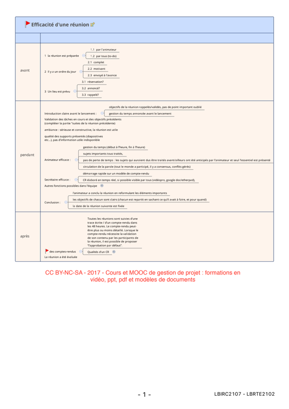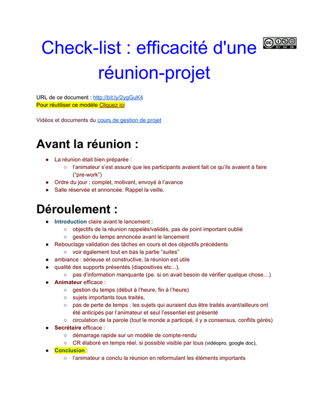 Check-list : efficacité d'une réunion-projet URL de ce document : http://bit.ly/2ygGuK4 Pour réutiliser ce modèle Cliquez ici Vidéos et documents du cours de gestion de projet Avant la réunion : La réunion était bien préparée : l’animateur s’est assuré que les participants avaient fait ce ...